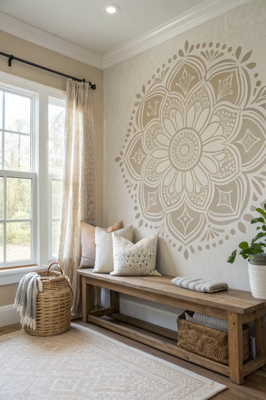Stenciled wall patterns breathe new life into spaces, offering a simple yet striking transformation.