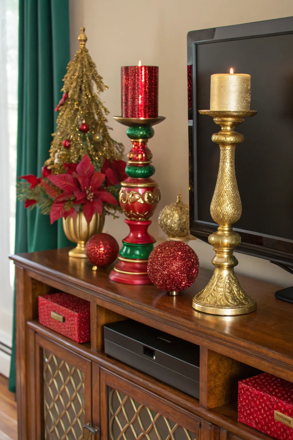 - Glossy Painted Candle Pillars: Brighten your TV stand with glossy painted candle pillars for a festive touch.