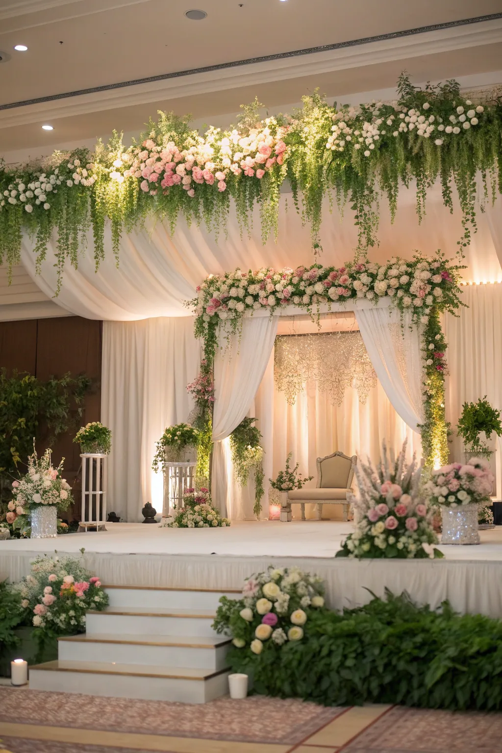 Transform your wedding stage into a floral paradise with abundant flowers in the backdrop and overhead decor. I adore mixing lush greenery with vibrant blooms to create a dreamy atmosphere.