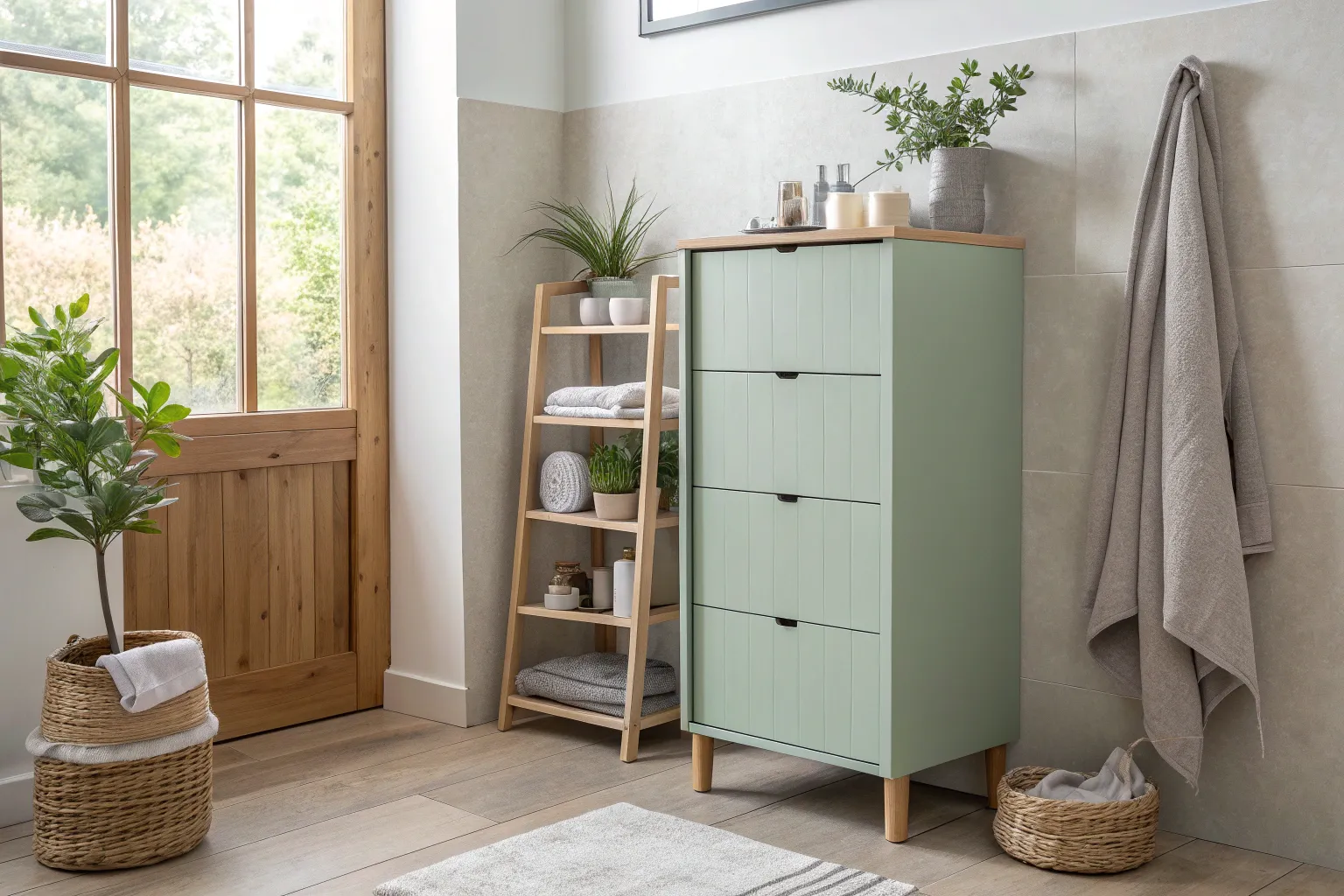 - Bamboo Folding Ladder: Enhance your bathroom decor with a versatile bamboo ladder for stylish towel organization.