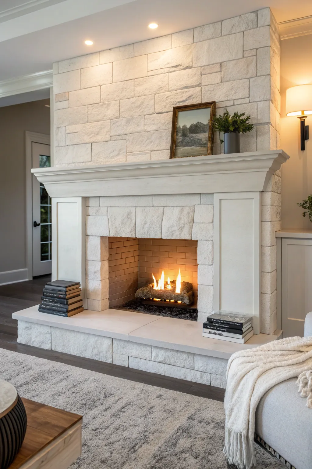 - Natural White Stone Slabs: Transform your fireplace with sleek, minimalist natural white stone slabs for a modern vibe.