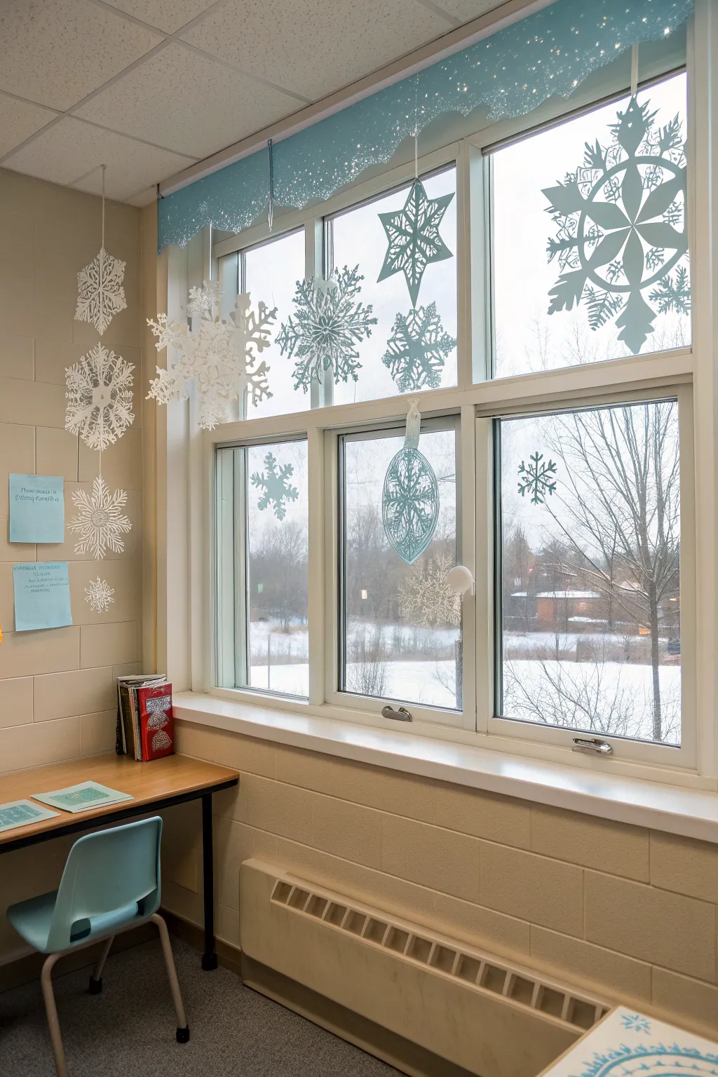 Hang delicate snowflakes from the ceiling to create a whimsical winter sky. It’s a simple way to add depth and interest to the classroom atmosphere.